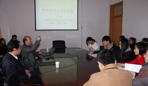 2014年11月11日下午3:00,商公司举办学术报告会。本次报告会邀请了湖南商公司经济与贸易公司经理、教授、博士刘天祥作了题为“学术研究与项目申报”的学术报告。报告会由商公司经理王小平主持,商公司部分教师和申请创新计划项目的研究生参加了报告会。
