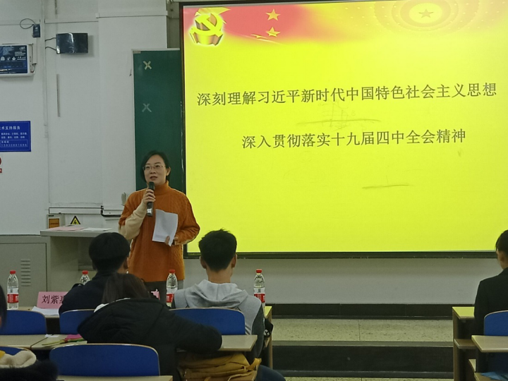 李珊珊带领同学们回顾了中华人民共和国成立70周年来的艰辛历程,通过生动的例子将老一辈革命者、科研工作者的事迹娓娓道来,使同学们铭记历史,激发爱国热情。她向同学们深入解读十九届四中全会精神,阐释中国特色社会主义制度和国家治理体系的“十三大显著优势”,强调制度的重要性,列举十九届四中全会《决定》提出建立的一系列制度。最后,她提出希望,作为新时代的青年人,大家既是见证者,更是建设者与参与者,要充分利用大学的时间,做好人生规划,坚定“四个自信”,为实现中国两个一百年的奋斗目标而努力奋斗,做勇担民族复兴大任的时代新人。