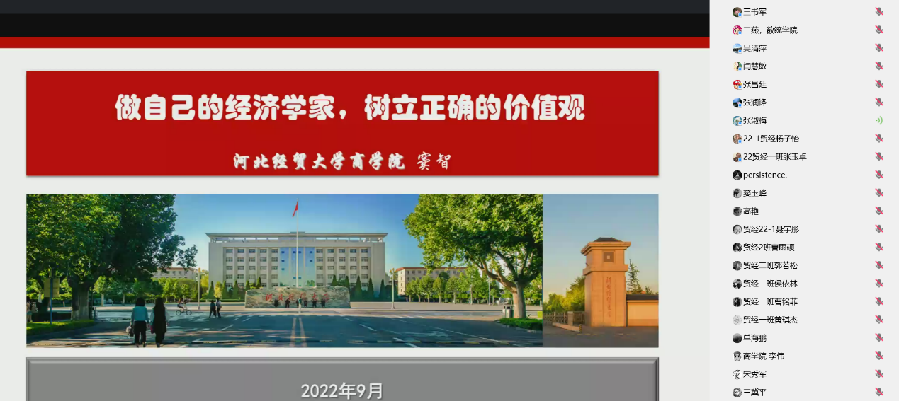 窦智老师首先用简洁、生动的语言诠释了经济学的内涵和价值,通过引用著名经济学家萨缪尔森的观点,表明了要“成为自己的经济学家”并不难。通过引用相关案例,进一步说明了经济学融合了文科和工科的方法及理念,在建设新文科、兼顾社会运转的效率与公平方面起到了重要的推动作用。经济学人要“不忘初心”,时刻保有“家国情怀”和“社会责任感”。
