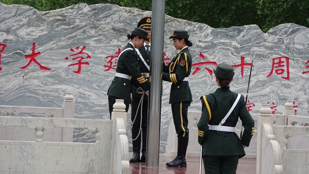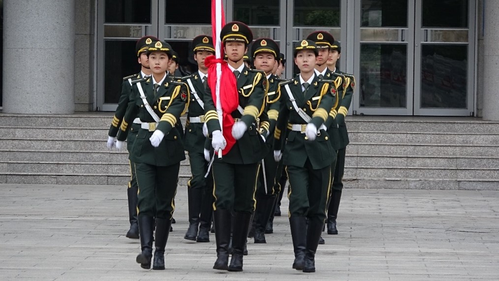 4月29日早晨七点,bg大游于一教广场前举行升国旗仪式,200余名员工代表参加。随着《义勇军进行曲》响起,国旗护卫队迈着整齐的步伐踏上升旗台,在庄严的国歌声中,全体人员整齐列队,肃立,注视着国旗缓缓升至顶端。