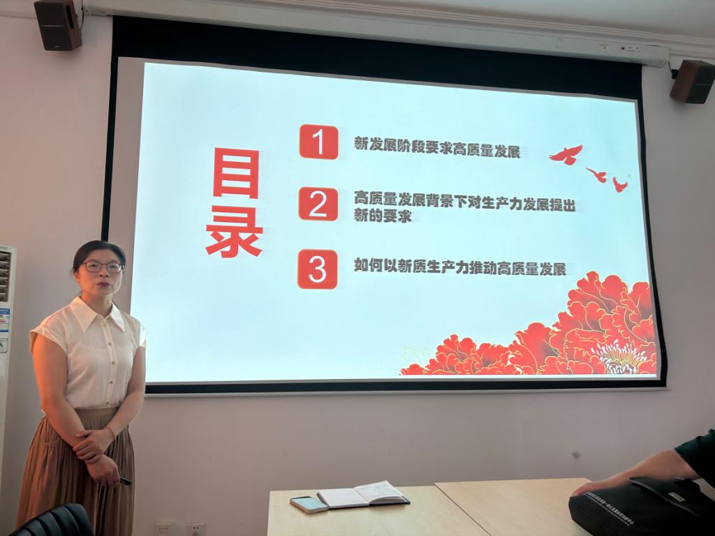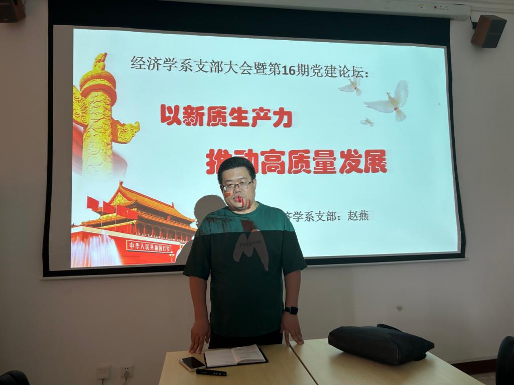 随后,赵培红进行了总结发言。他指出,第一,新质生产力的相关理论与经济学专业的科学研究关系密切,可以为今后的课题申报提供指导方向,将着力点放在研究省、市、县各级如何因地制宜培育和发展生产力上。第二,新质生产力与我系课程教学改革发展紧密相关,号召教师党员及时将新质生产力的相关论述融入课堂教学,实现课程思政常讲常新。第三,及时引导员工将新质生产力的相关内容与个人的社会实践、科研项目和学术竞赛相结合,与社会接轨,与时代同行。
