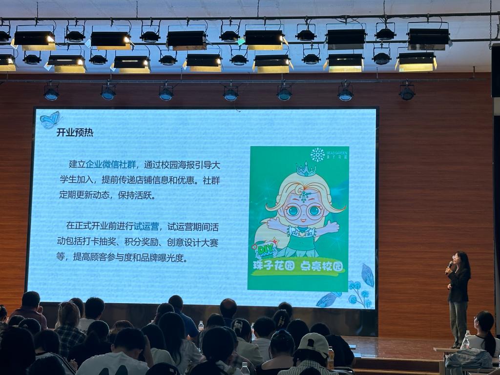 此次比赛面向全校师生,经过初赛“珠子花园”高校版加盟店经营策划案的选拔,最终来自六个公司的6支团队进入决赛。决赛赛程设置分为“珠子花园”探店微视频展示、经营策划案PPT讲解和现场答辩三个环节,活动期间设有抽奖环节,以提高现场观众的关注度和参与感。