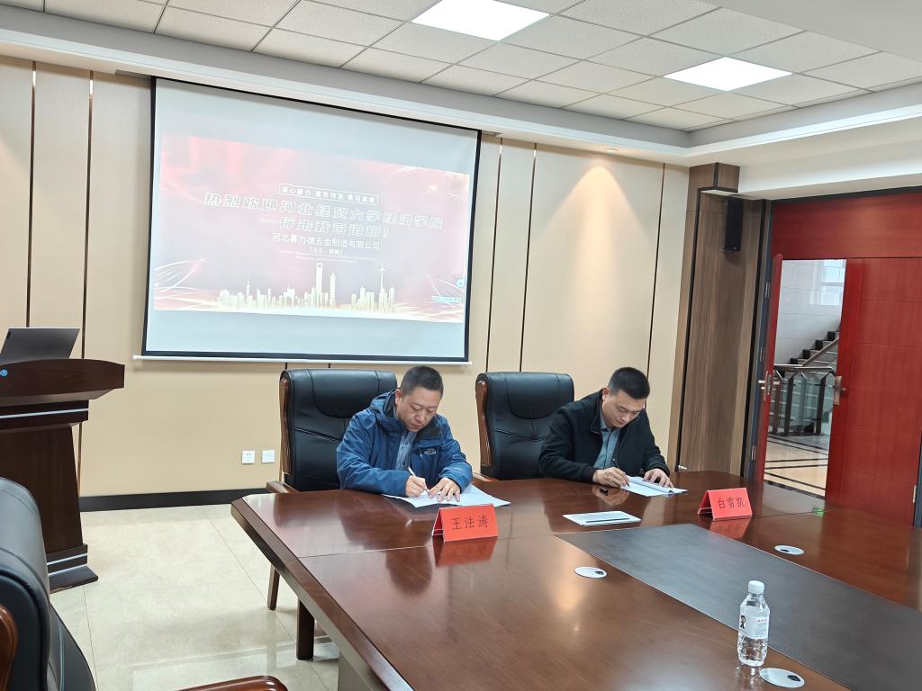 唐伟强介绍了永年区经济发展情况和紧固件产业基本情况,郭勇介绍了永年紧固件产业的生产现状、行业优势和市场情况,董茂通分享了永年紧固件产业的发展历史和行业特征。刘振滨介绍了公司的基本情况,王重润详细介绍了公司与当地紧固件产业集群合作的7个方面内容。校政企三方围绕团队建设、人才培养、科学研究、创新平台、实习就业等方面展开充分交流,深入探讨了下一步合作意向和合作模式,并达成一些初步合作意向。公司与喜力德五金制造有限公司共同签署了《校企合作协议书》。