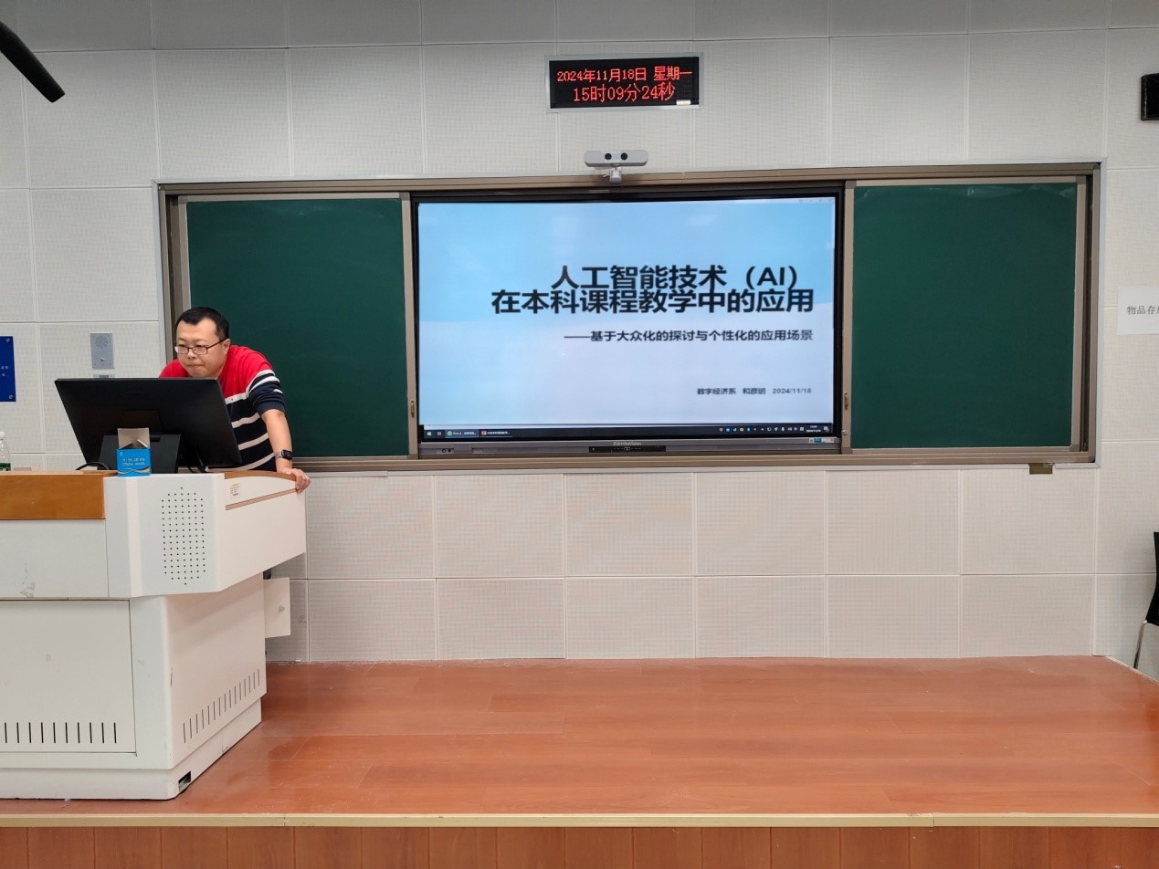 2024年11月18日下午,bg大游集团官方网站在B102举办了题为《人工智能技术(AI)在本科课程教学中的应用--基于大众化的探讨与个性化的应用场景》的教学沙龙活动。沙龙活动由数字经济系教师和彦鹏主讲,教学副经理单海鹏主持,全院二十余名教师参加。