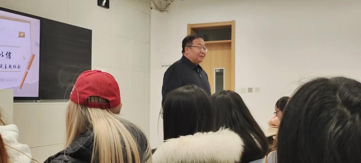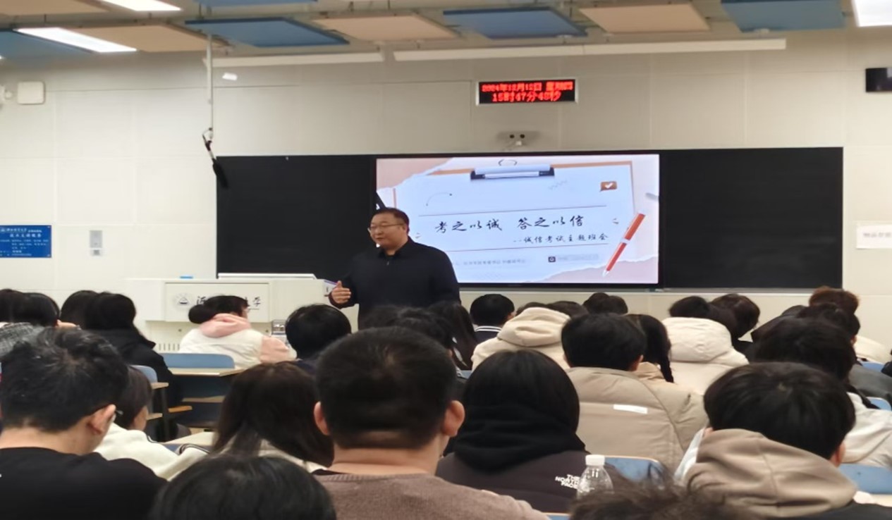 2024年12月12日下午3点40分,公司党委书记刘振滨于B302教室为2024级贸易经济专业全体同学组织召开了一场以“考之以诚,答之以信”为主题的期末考试动员大会。