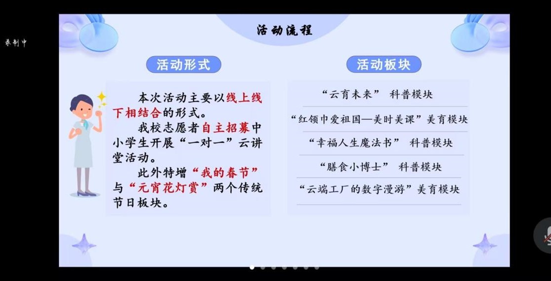 动员大会上,活动负责人对云讲堂的整体规划与课程设置进行了细致阐释。本次活动采用线上线下相结合、一对一辅导的形式,精心打造了多元化的课程体系,其中包括“云育未来”“幸福人生魔法书”“膳食小博士”科普板块、“红领巾爱祖国—美时美课”“云端工厂的数字漫游”美育板块,此外还特别增设“我的春节”与“元宵花灯赏”两个传统节日板块。
