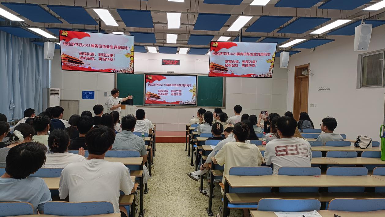 最后,他向毕业生党员庄严号召,希望大家牢记党员身份,不忘入党初心,将“知行合一经世济用”的院训与为共产主义事业奋斗终身的崇高信仰紧密融合,在经济建设的广阔天地里,在民族复兴的伟大征程中,勇担使命、锐意进取、廉洁奉公、无私奉献,用智慧和汗水书写无愧于党、无愧于人民、无愧于时代的青春华章!