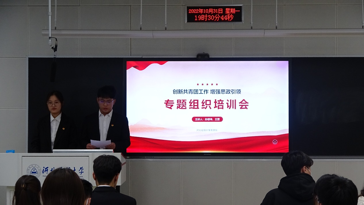 2022年10月31日晚7点30分,商公司于第三教学楼B302召开团干部专题组织培训会。会议由商公司团委组织部和团委办公室举办,由院团委办公室主任孙禄坤、组织部部长王茜主讲,商公司团干部100余人参加会议。