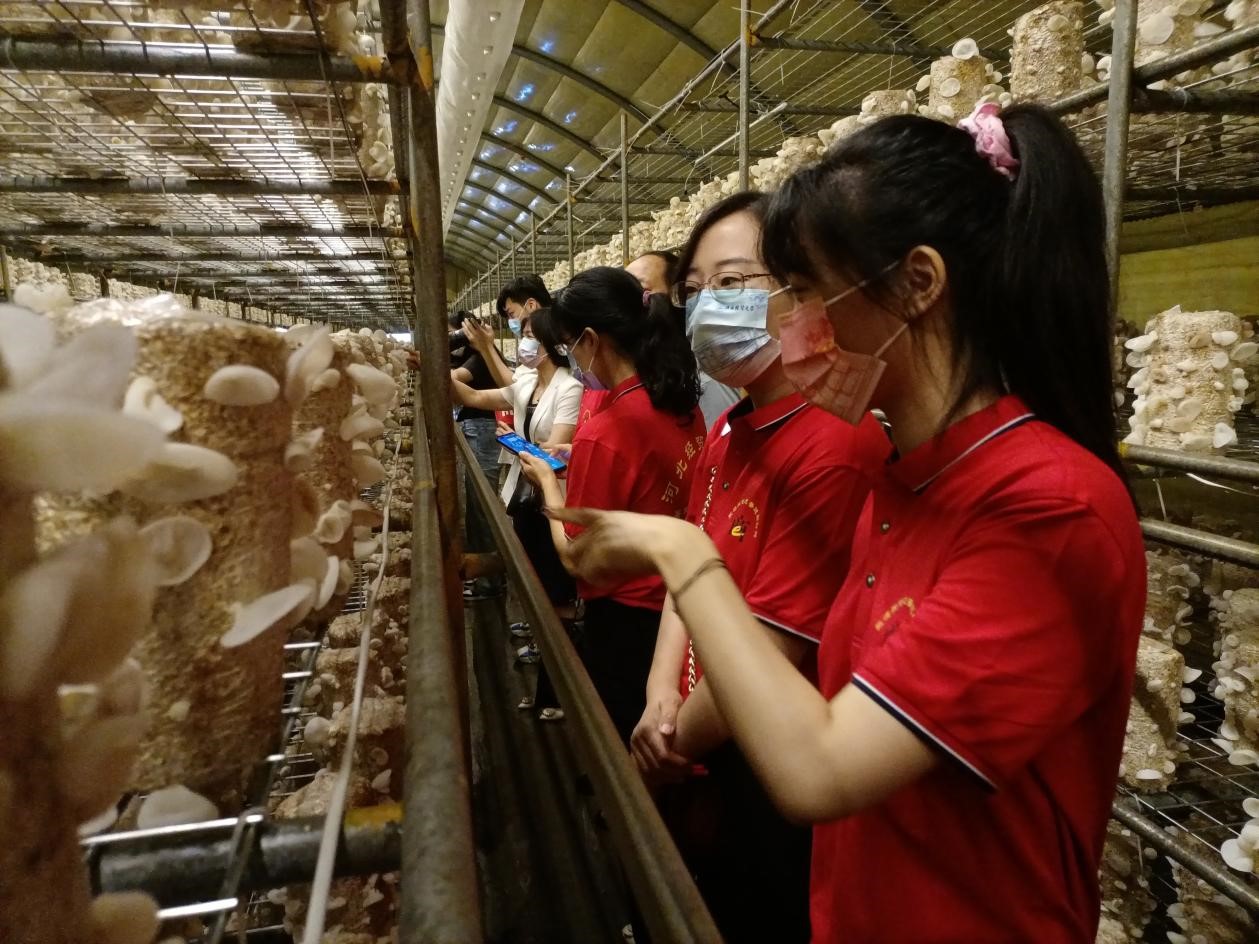 图为“商贸菁英”乡村振兴实践团走进双盛种植园蘑菇大棚调研学习