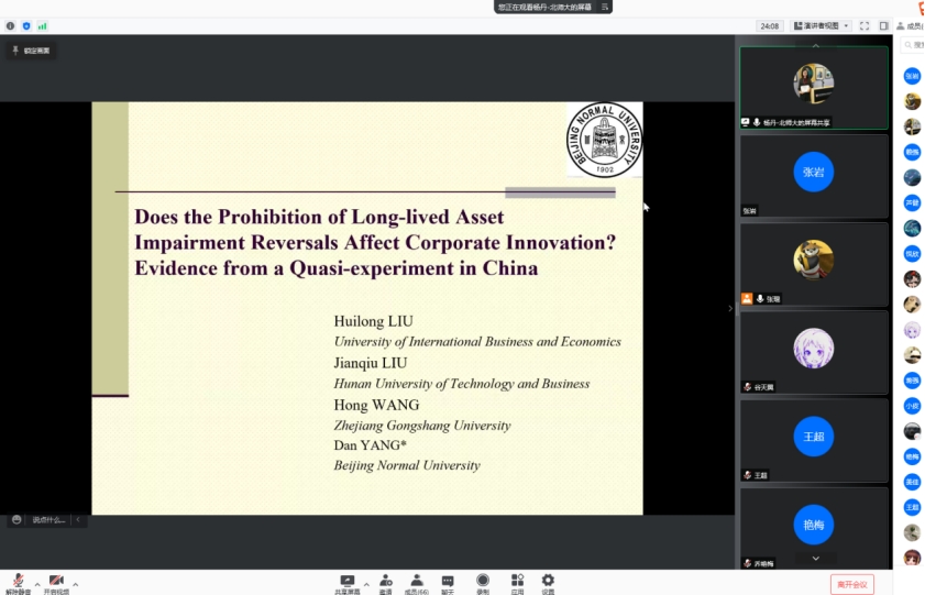 11月16日,北京师范大学博士生导师杨丹副教授应商公司邀请,于线上作了题为“禁止长期资产减值转回是否会影响公司创新?——来自中国的准实验证据”的学术报告。报告由张琨老师主持,公司60余名师生参加。