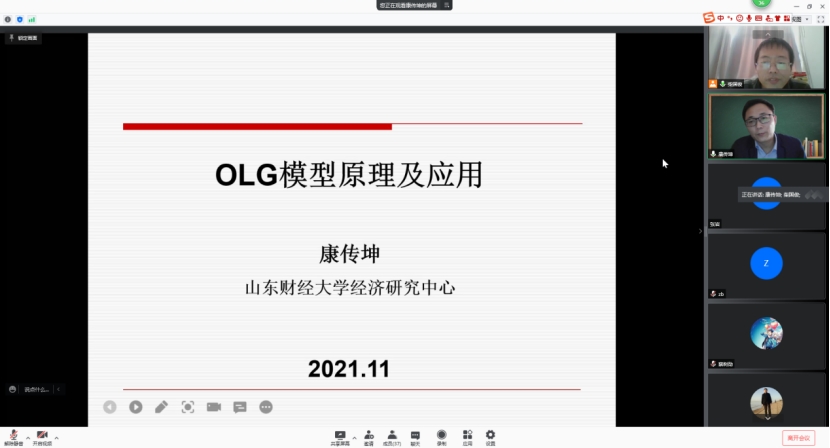 11月22日,山东财经大学康传坤副教授应商公司邀请,于线上作了题为“OLG模型原理及应用”的学术报告。报告由柴国俊老师主持,公司40余名师生参加。