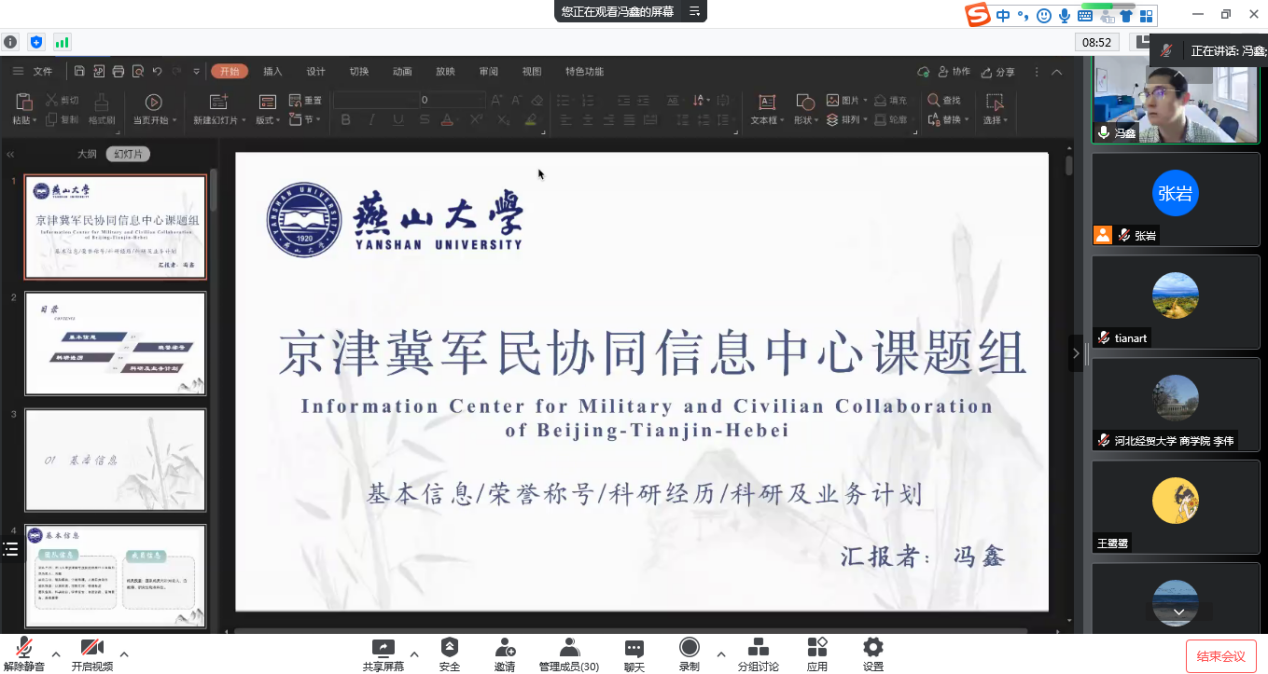 5月30日,燕山大学冯鑫副教授应商公司邀请,于线上作了题为“社会计算前沿探索与新型智库建设浅析”的学术报告。报告由王法涛副教授主持,院内三十余名师生参加了本次报告会。