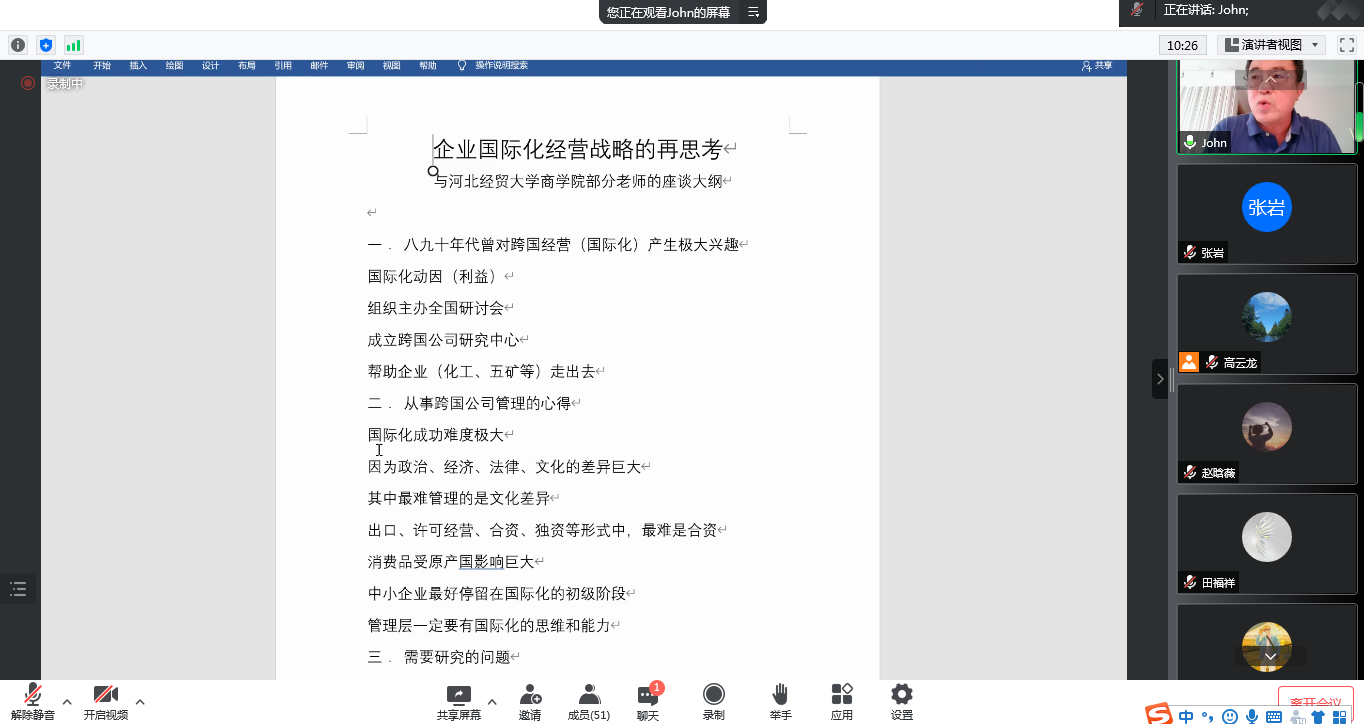 6月18日,德国路德维希国际公司董事局顾问张景智应商公司邀请,于线上作了题为“企业国际化经营战略的再思考”的学术报告。报告由高云龙副教授主持,公司五十余名师生参加。