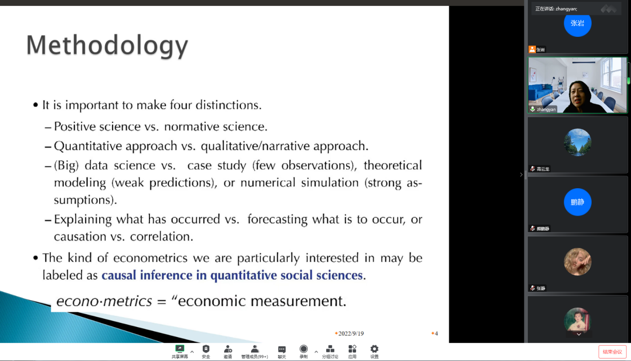 张艳首先从问题提出、文献综述、数据整理、软件使用、实证模型设定、结果汇报、论文撰写和发表的全流程等方面讲述了撰写规范的经济学实证论文的方法。其次,张艳结合论文“Land prices and Eexport: Evidence from China”,深入浅出地讲解了该论文从选题到撰写的整个流程,为同学们开展学术研究提供了指导和帮助。