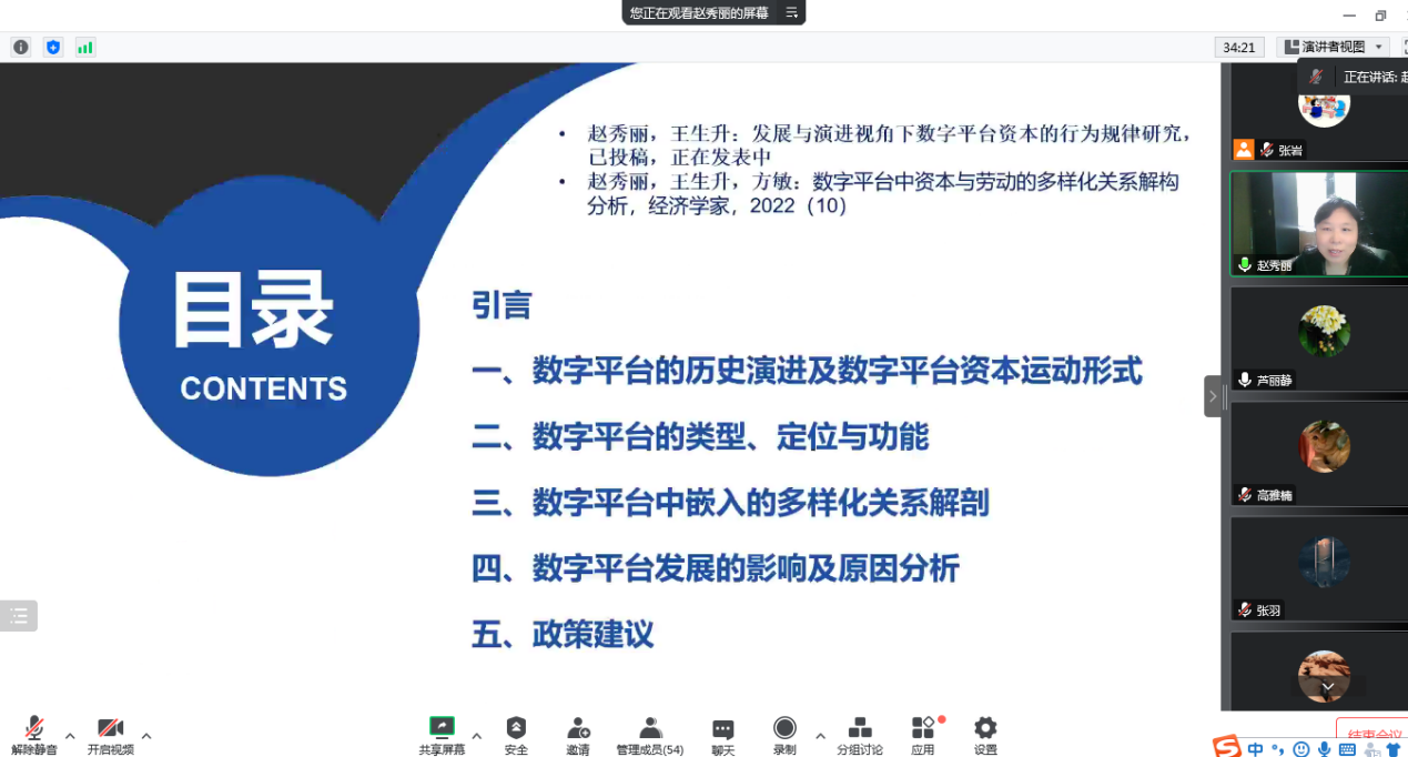 10月20日,福建师范大学赵秀丽教授应商公司邀请,于线上作了题为“数字平台的历史演进、功能定位及关系解剖”的学术报告。报告由芦丽静老师主持,公司五十余名师生参加。