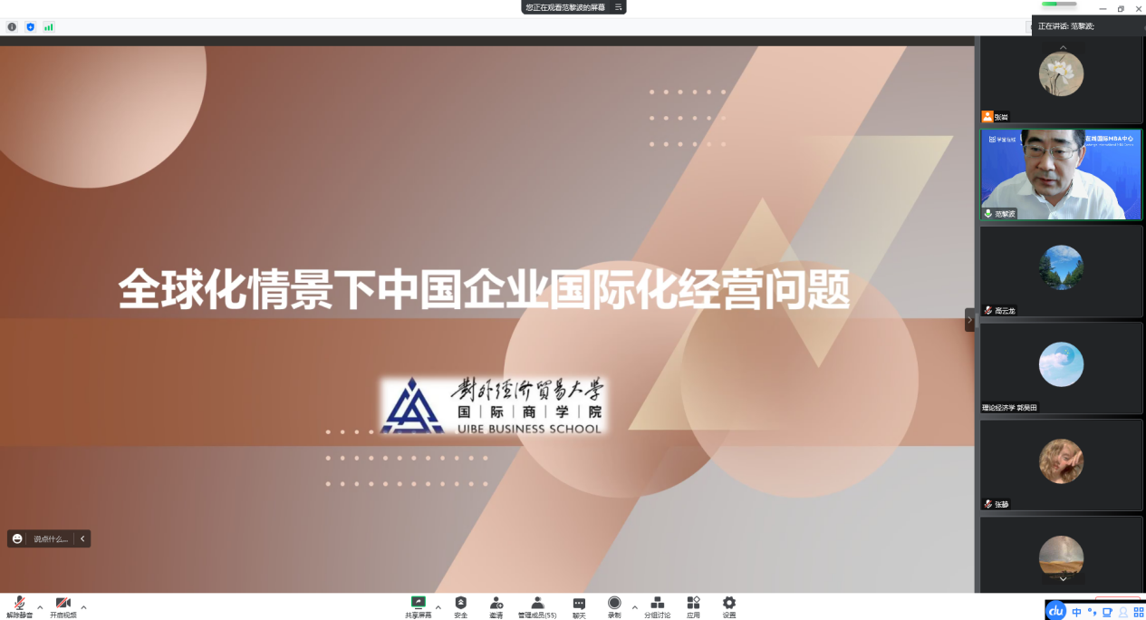 10月24日,对外经济贸易大学博士生导师范黎波教授应商公司邀请,于线上作了题为“全球化情境下中国企业国际化经营问题”的学术报告。报告由高云龙老师主持,公司五十余名师生参加。