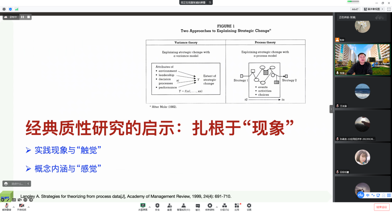 张斌首先分享了周雪光田野调查、《街角社会》、《决策的本质》等经典质性研究,并比较了Eisenhardt、Gioia和Langley三种案例研究范式的理论构建,综合上述案例,张斌认为案例研究能够全方位锻炼研究人员的各种能力,有利于培养学术性人才和致力于业界发展的员工。其次,张斌从理论检验与理论构建、单案例和多案例的理论构建两个角度阐释了理论构建的内涵。最后,张斌选择了数字企业、混合所有制企业、通信运营商作为案例分析对象,阐释双案例研究在理论构建中的一些思路和逻辑。