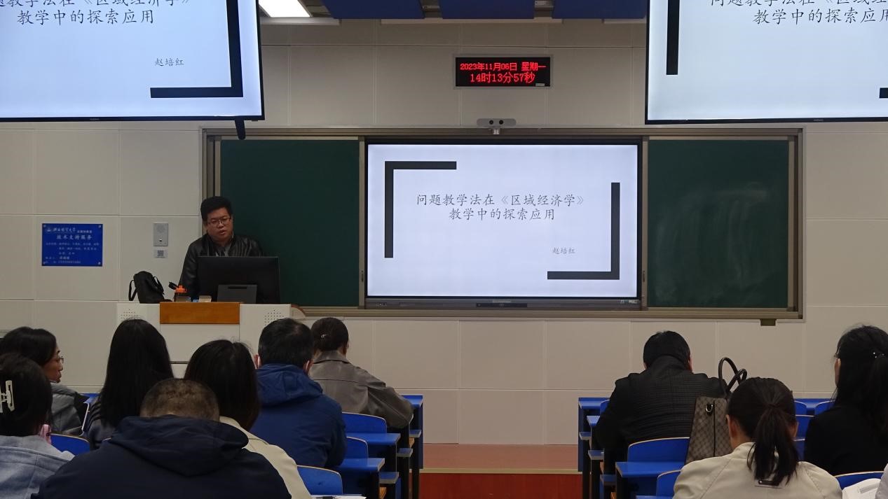 2023年11月6日下午,商公司在北三教B102教室举办了题为《问题教学法在〈区域经济学〉教学中的探索应用》教学沙龙活动。沙龙活动由经济学系赵培红老师主讲,教学副经理单海鹏主持,全校40余名教师参加。