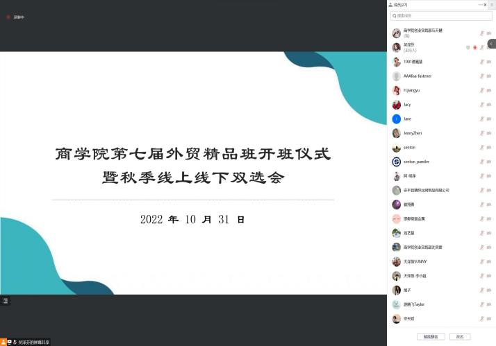2022年10月31日下午2点,商公司于北三教B302举办了第七届外贸精品班开班仪式暨秋季线上线下双选会。商公司党委副书记侯彦利、爱德会展有限公司总经理崔翔勇、十余位企业负责人以及全院90余名员工参加会议。活动由商公司就业工作负责人李婷主持。
