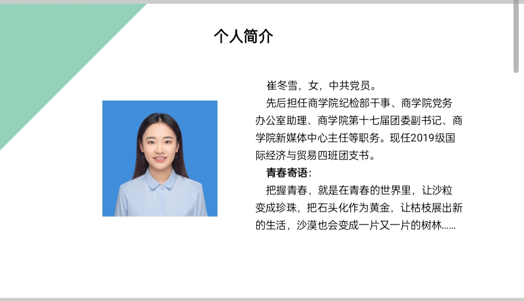 崔冬雪和邵项杰强调了处理好学习与工作的关系的重要性。崔冬雪从学业、活力团支部的打造等方面进行了经验分享。“学习之上,勤勉进取;先是学习,后是干部”,邵项杰从如何平衡好学习与工作进行经验分享,为新生提供非常有价值的参考。