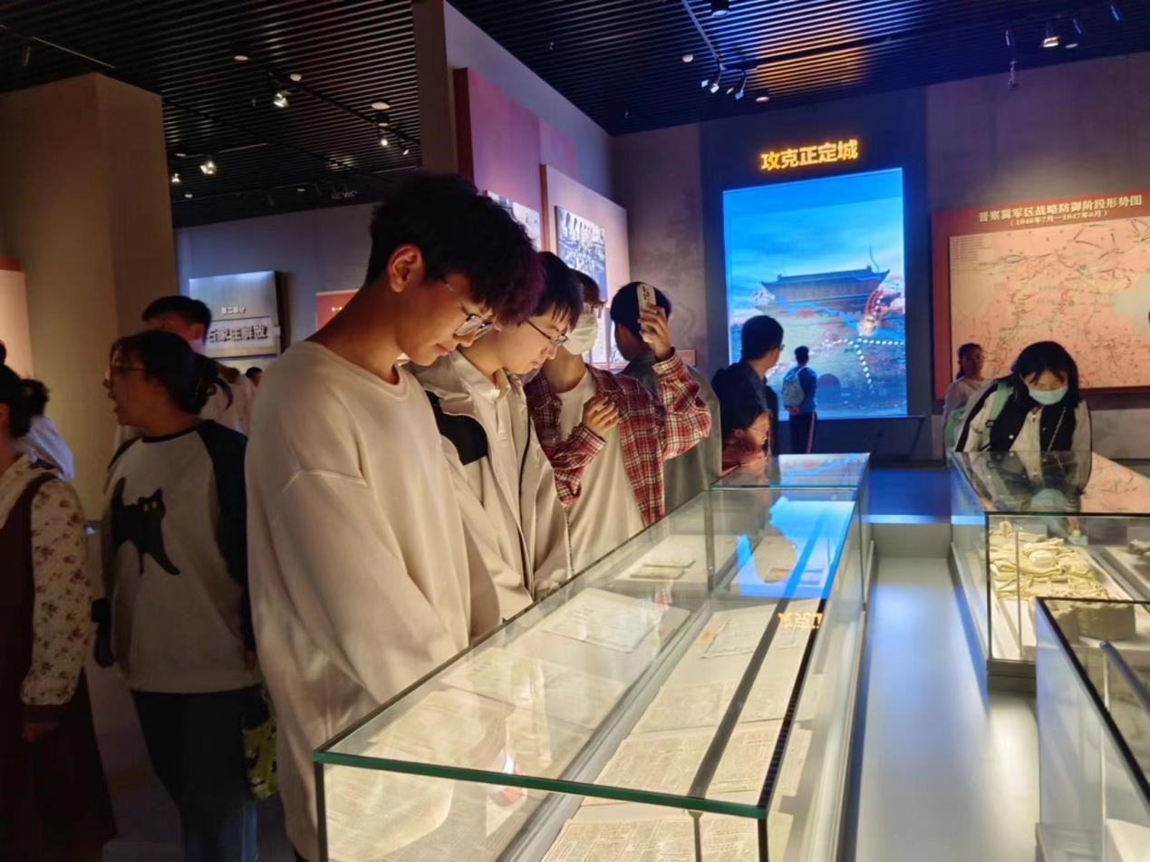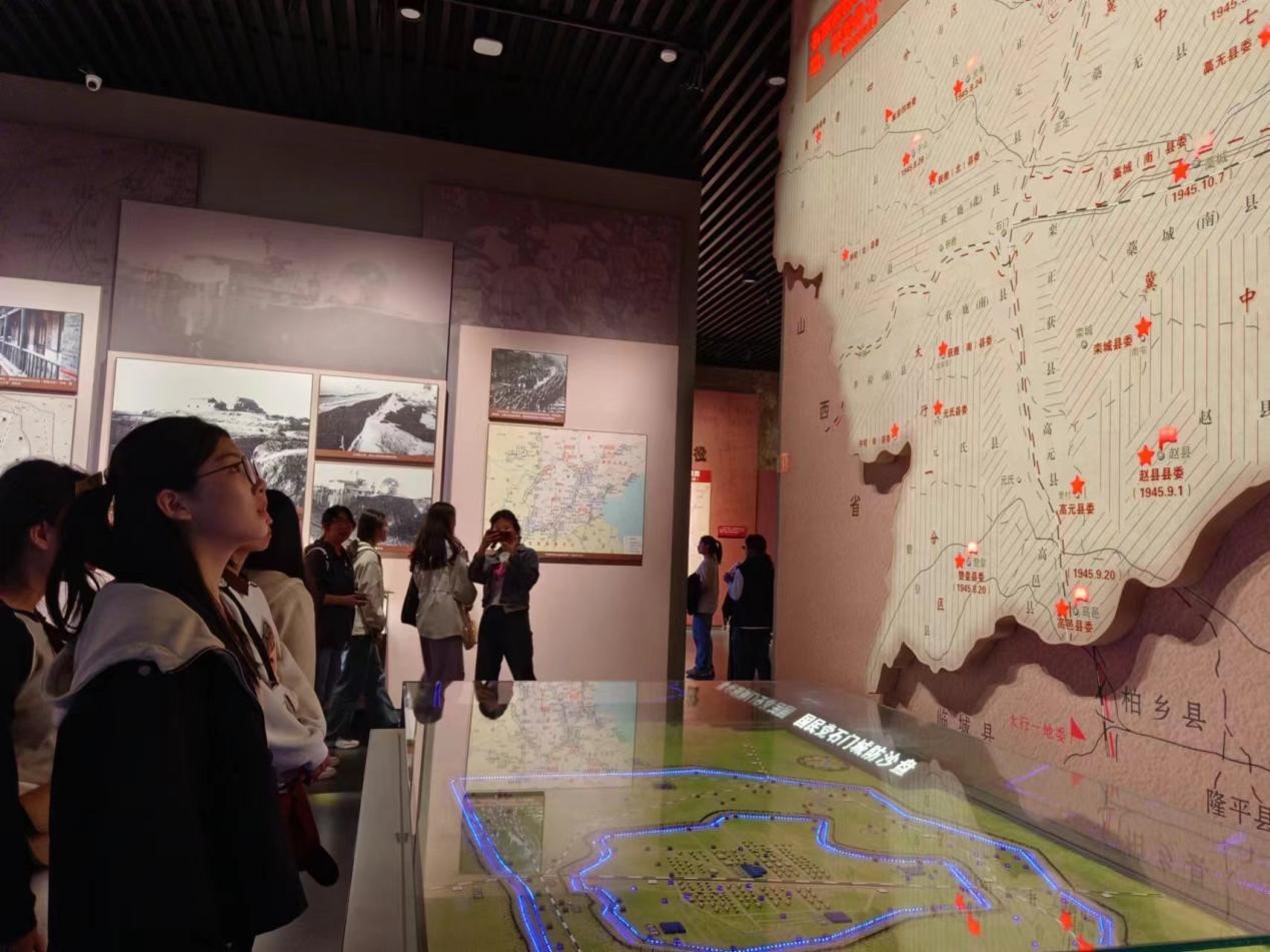 第二展厅为“开国第一城”,该展厅打造出了中国首个红色纪念馆沉浸式观演项目。在这里,同学们可以通过新型声光电、VR等现代技术沉浸式体验攻占大郭村机场、街巷激战、活捉敌首刘英等著名战役。在热爱历史的同学讲解下,同学们深刻领略到无数革命先驱为石家庄解放做出的伟大贡献,以及石家庄最终解放的来之不易和激动心情。